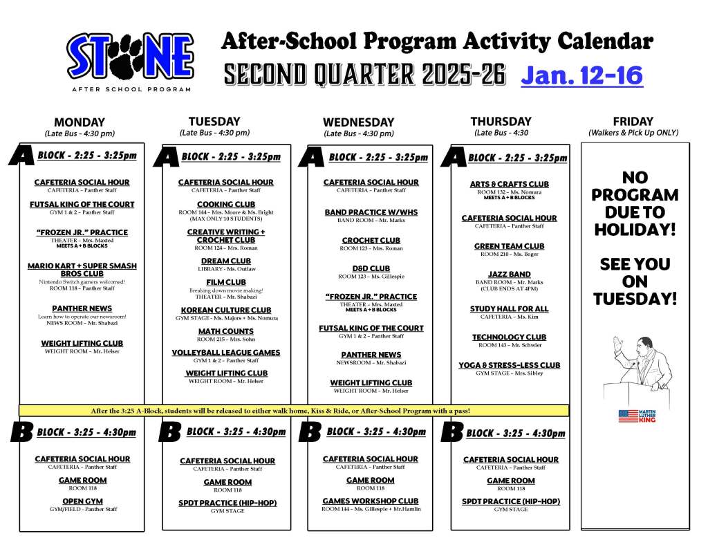 This page will contain our latest weekly Activity Calendar for the 2025-26 school year. Calendars will be updated every Friday! Also, you’ll be able to access and download all of the required forms needed to participate in the Stone After-School Program.
